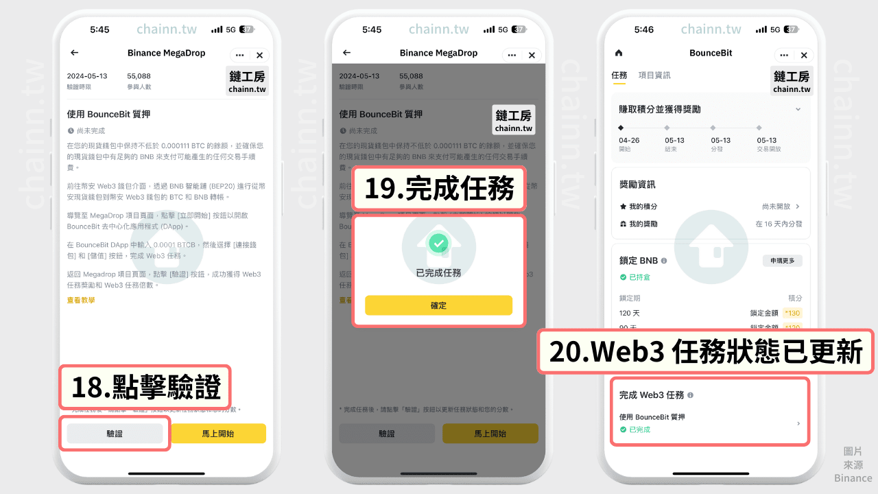最後一定要回到幣安 Megadrop 那邊點擊「驗證」按鈕,有跳出「已完成任務」的畫面就可以囉~後面回到 BounceBit 活動頁面也可以確認任務狀態。