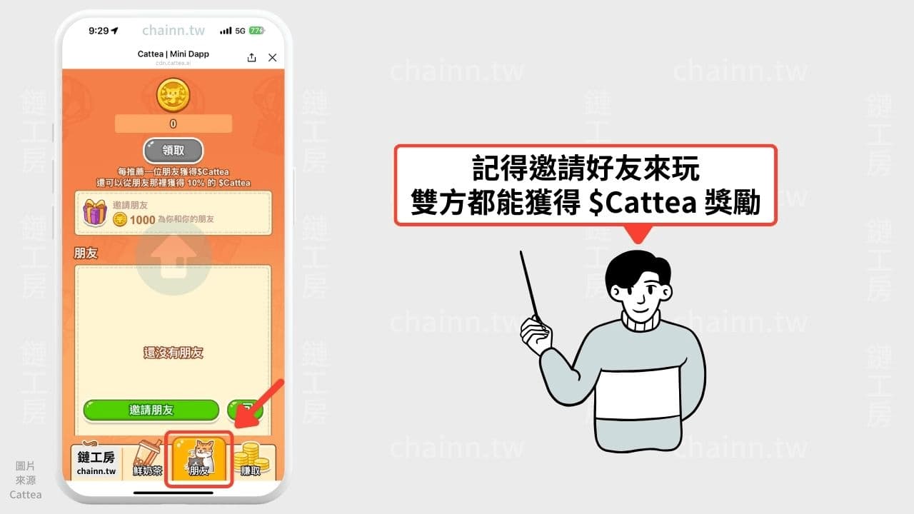 邀請好友到 Cattea 玩遊戲的話,雙方都可以賺到金幣獎勵 $1000(TG 邀到 Telegram Premium 的獎勵更多),並且你還可以從朋友那邊獲得 10% 的 $Cattea 獎勵。所以朋友如果玩這個很強的話,你就可以分到不少獎勵。